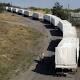 Trucks marked as being from a bitterly disputed Russian aid convoy to Ukraine stand in line as they return to Russia on the border post at Izvaryne, eastern Ukraine. An Associated Press reporter counted 67 trucks entering the border crossing in the Russian ...
